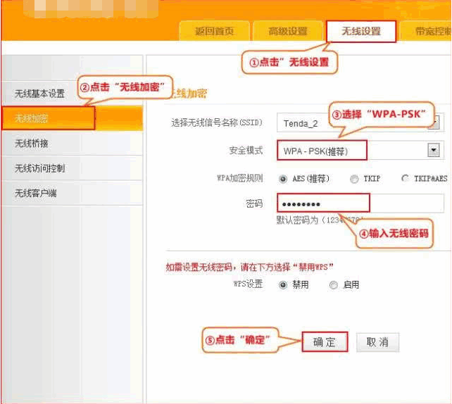 2、设置主路由器的无线密码,单击无线设置、无线加密,修改无线密码。