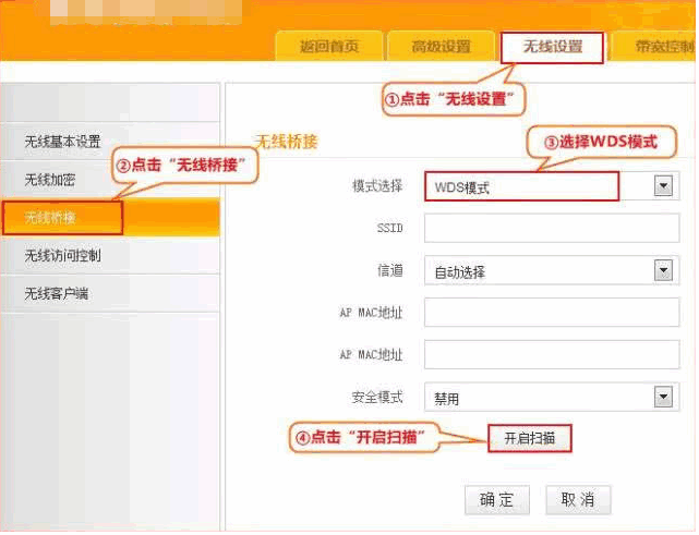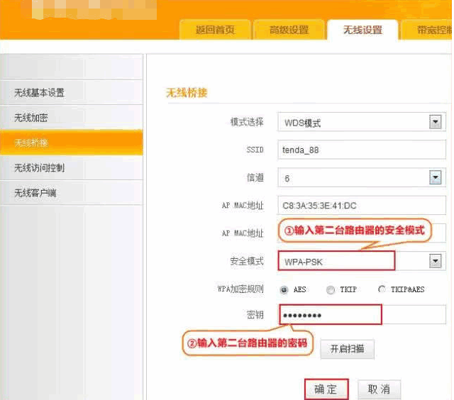 11、登录到主路由器管理界面192.168.0.1,单击无线设置、无线基本设置,然后选择无线网桥以打开对第二台路由器的WiFi的扫描。