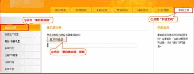 10、重新启动辅助路由器。单击系统工具、重启路由器、重启路由器。