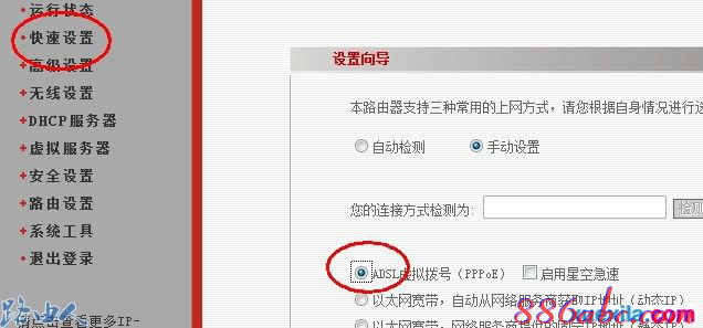 但是如果你是局域网内或者通过其它特殊网络连接(如视讯宽带、通过其它电脑上网之类)可以选择以下两项“以太网宽带”来进行下一步设置。这里先说明一下ADSL拨号上网设置,以下两项在后面都将会进行说明。