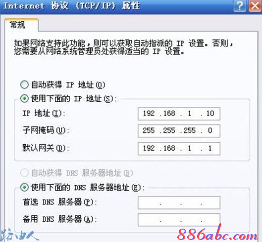 (2)单击“使用下面的IP地址”,输入IP地址192.168.1.X(X范围2-254)、子网掩码255.255.255.0、默认网关192.168.1.253,确定即可。