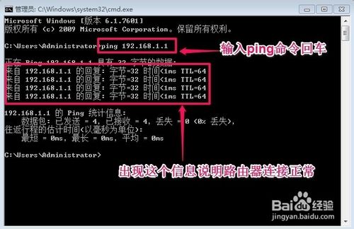 现在你在浏览器中输入你的路由器地址192.168.1.1【假设是这个】,看能不能进去路由器,如果还不能登录路由器,我们可以检测一下路由器是否已经连接信号,我们在开始菜单的搜索框中输入命令cmd,然后打开命令提示窗口!然后再命令提示窗口中输入ping 192.168.1.1然后回车看提示信息!