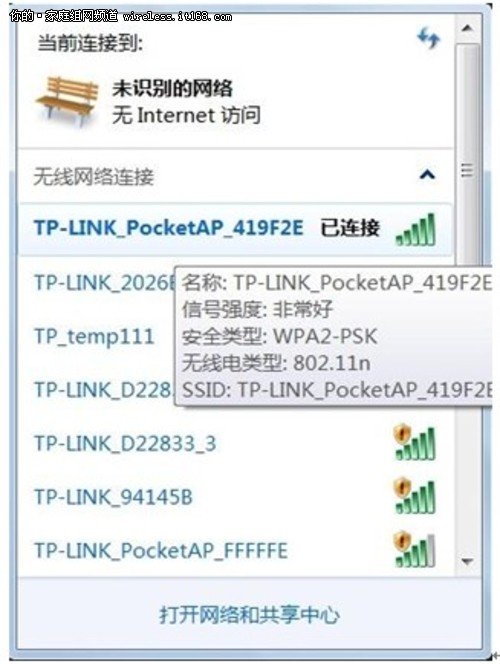 步骤6:重启完成,此时TL-WR700N的无线网络已经设置了无线安全,电脑的无线网络连接会自动断开,需要重新连接TL-WR700N的无线网络(本例中SSID为TP-LINK_PocketAP_419F2E),连接过程中需要输入TL-WR700N的无线PSK密码(本例为abcdefgh),连接上之后,如下图所示。