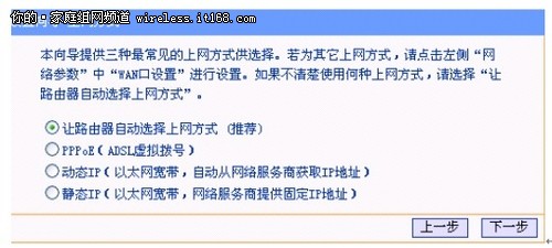 那是现正在的无线路由器比力智能的处所,路由于有的用户大概不知道本人的上彀类型,那末便可以选择那一项,路由器会主动判定您的上彀类型,然后跳到响应上彀体例的设置页里。为了路由器可以或许精确判定您的上彀类型,请您的路由器已准确毗连。所以那一项也是我们所保举的。