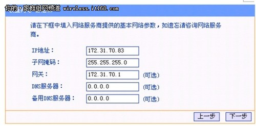 若是您的上彀体例为静态IP,收集办事商会给您供给IP地点参数,则需要鄙人图所示页里中输进ISP供给的参数: