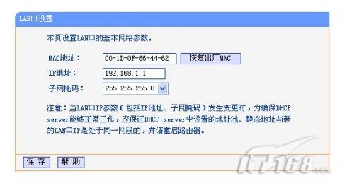 MAC地址是本路由器对局域网的MAC地址,此值不可更改。IP地址是本路由器对局域网的IP地址,局域网中所有计算机的默认网关必须设置为该IP地址。需要注意的是如果改变了LAN口的IP地址,必须用新的IP地址才能登录本路由器进行WEB界面管理。