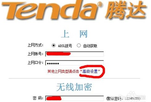 第三步、在输入密码登陆后,出现了腾达无线路由器的设置窗口,在这里边我们可以看到你在上网账号密码还有最下面,就有无线加密。这里也就是修改无线WIFI密码的地址。可以在这个地方直接输入你的新密码,并且点击确定按键。