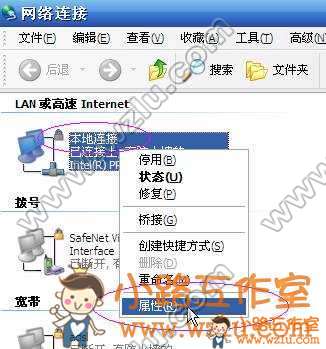 启动,右键单击桌面或“开始”中的“网上邻居”选“属性”,
