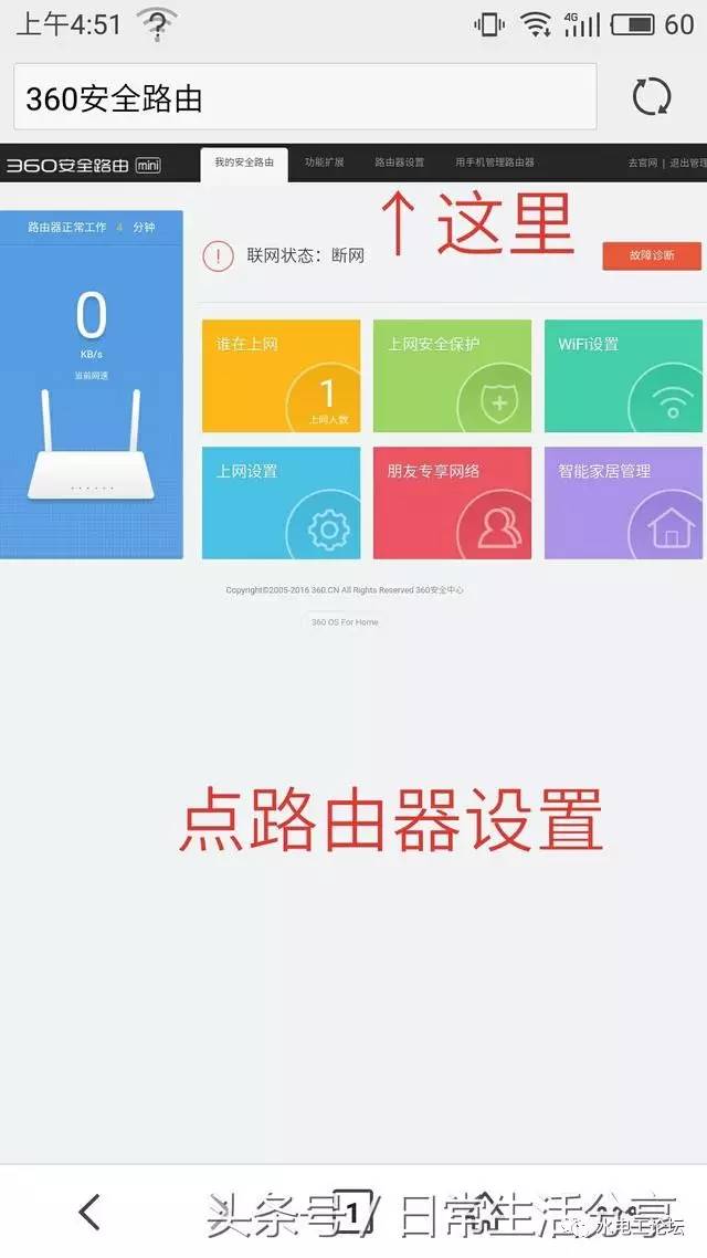 下面开始设置,全程使用手机。路由器放窗台插上电,先恢复出厂设置。然后手机连接上360路由器,开始都是没有密码的直接连接,打开手机浏览器输入192.168.0.1开始设置,下面是设置图片。