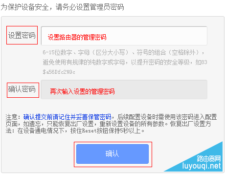 初次进入路由器管理界面,为了保障您的设备安全,需要设置管理路由器的密码,请根据界面提示进行设置。如下图: