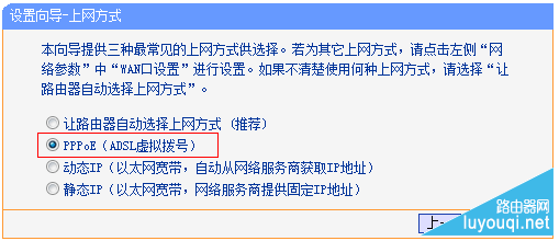 上网方式选择 PPPoE(ADSL虚拟拨号) ,点击 下一步。