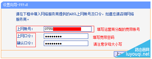 在对应设置框填入运营商提供的宽带账号和密码,并确定该账号密码输入正确。