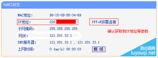 设置完成后,进入路由器管理界面,点击 运行状态,查看 WAN口状态,如下图框内IP地址不为0.0.0.0,则表示设置成功。