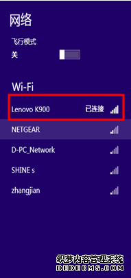 8. 打开您具有WLAN功能的设备(PC,平板电脑,手机),并扫描连接刚才设置的“移动AP”(Lenovo K900)既可分享手机的移动数据连接上网,如图1-8至图1-12所示。