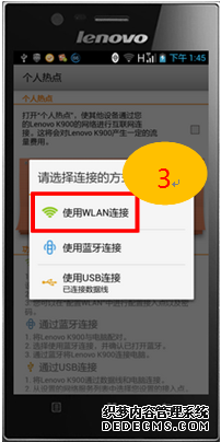 4) 除了“WLAN连接方式”外,还可以采用“蓝牙连接方式”或是“USB连接方式”来分享手机移动网络;
