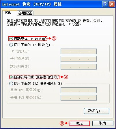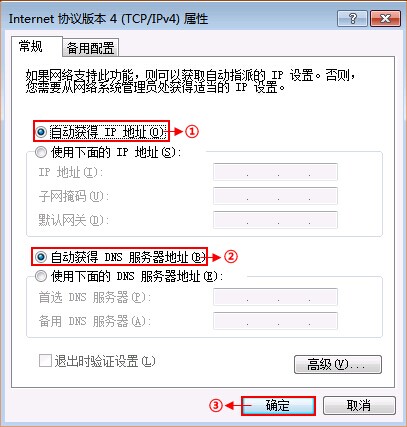 3、选择“自动获得IP地址”“自动获得DNS服务器地址”,“确定”即可: