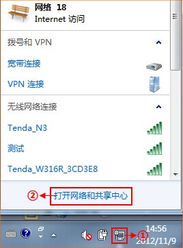 1、点击桌面右下角的网络图标,打开“网络和共享中心”。