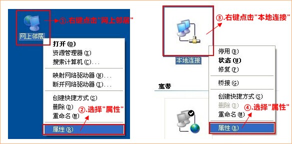 Windows XP系统IP地址设置(如下) 1、右键点击桌面上的“网上邻居”,按如下操作打开本地连接属性: