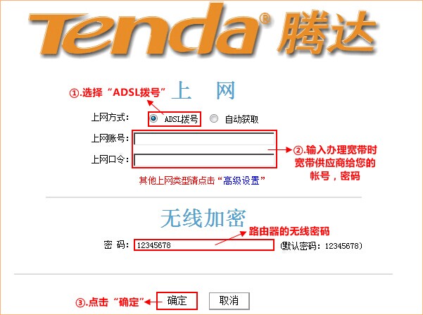 在页面中选择“ADSL拨号”,输入宽带的帐号和密码,“确定”即可,参考如下设置步骤:
