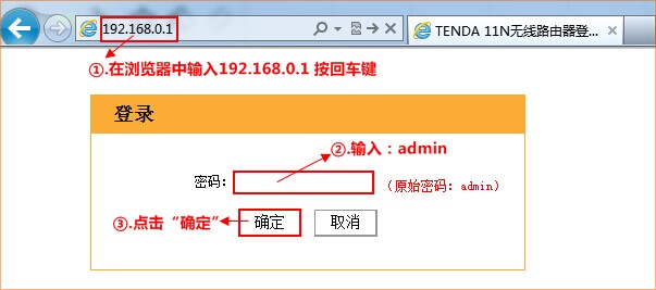 3.1 在浏览器中输入:192.168.0.1 按回车键,在跳转的页面中输入密码admin 点击“确定”。
