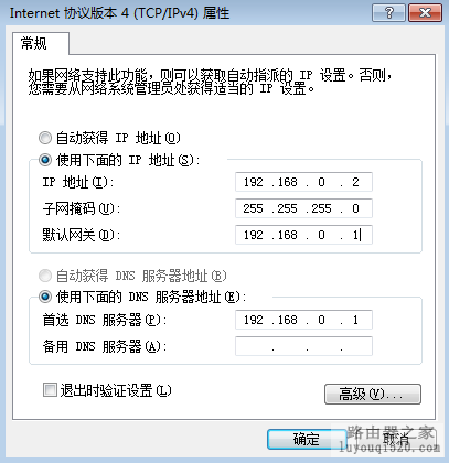如果你的路由器地址是:192.168.0.1,那么就如下设置