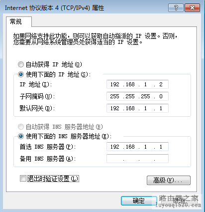 如果你的路由器地址是:192.168.1.1,那么就如下设置