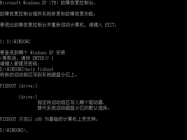 如图,是FIXBOOT命令的使用格式的帮助,该命令用来修复分区引导扇区。