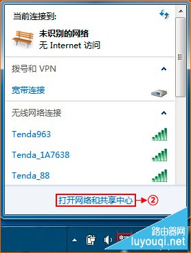 第一步:点击桌面右下角的网络图标,打开“网络和共享中心”