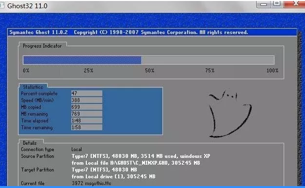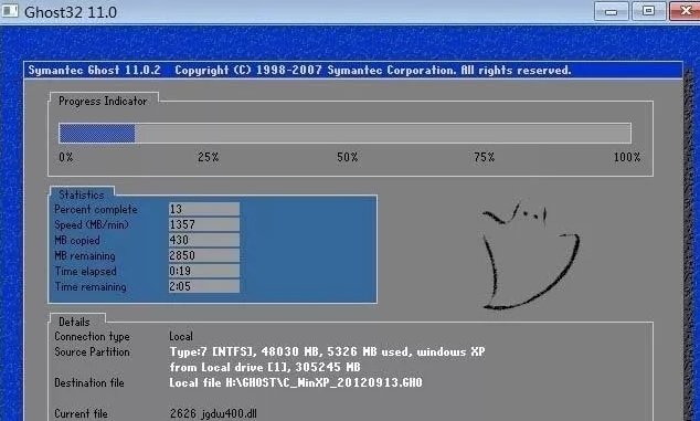 ? ? ? ?4、电脑重启后开始自动备份操作系统,下图中蓝色的进度条到100%后会自动重启,就是备份完成了。