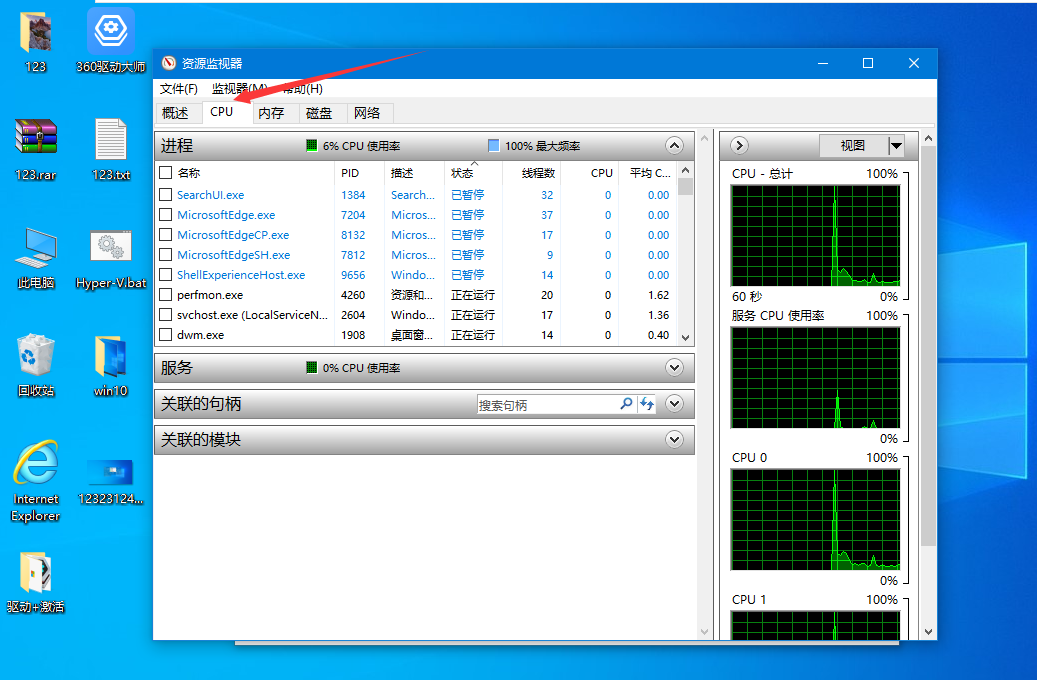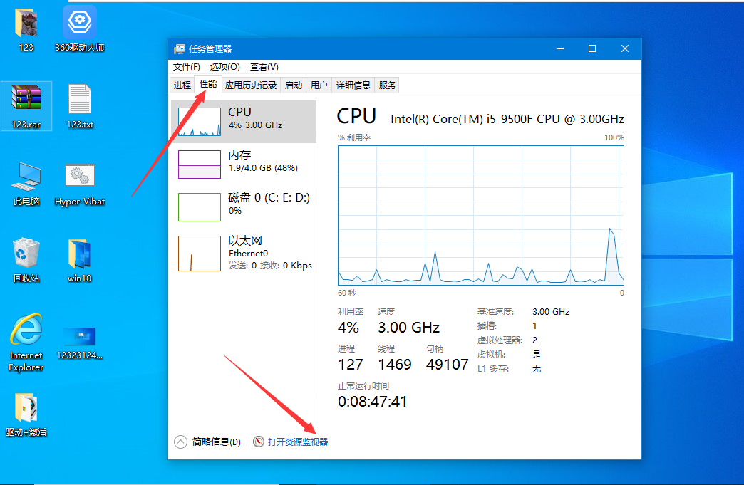 2、在弹出的窗口中点击性能选项,点击下方的打开资源监视器。