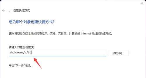 3、输入shutdown /s /t 0点击下一步按钮,如下图所示。