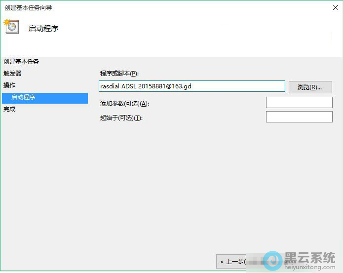 6、下面的这步是“启动程序”设置,也是最为重要的一部,在下面的“程序和脚本”下面输入键入任务脚本,不知道怎么输入的朋友,也可以点击后面的浏览,找到放在桌面的“宽带连接快捷方式”。如图所示