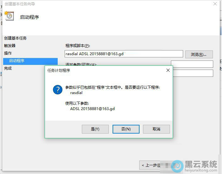 PS:请将ADSL换成宽带连接名称,前面我们创建的时候,就将宽带连接名称为ADSL,20158881@163.gd换成您的宽带账号,WWW.JB51.NET换成你的宽带密码。注意rasdial、ADSL、宽带账号和密码之间都有一个空格,不要将其连在一块。之后会弹出任务计划程序的提醒,这里我们直接点击“是”如下图。