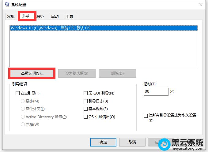 2.在“引导”标签页下,选中当前系统,点击“高级选项”按钮:
