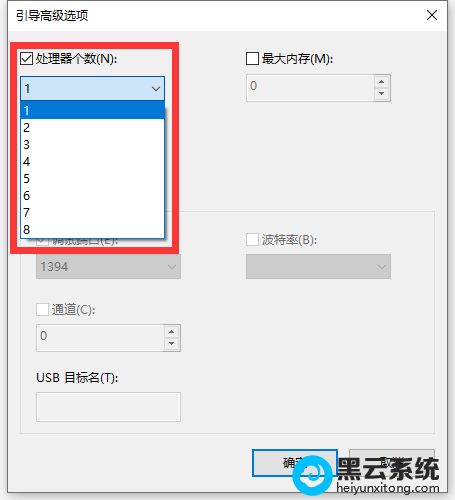 3.在打开的“引导高级选项”窗口中,我们可以看到上方有“处理器个数”的设置,勾选复选框后,即可设置需要启用的CPU个数,如果不勾选,一般来说都是以最多个数来启动,同时我们看到,右侧也可以选择启用的内存数量: