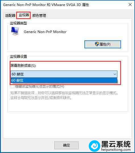 4、在最后的显示适配器属性中,在顶部切换到“监视器”选项,就可以看到“屏幕刷新率”设置了。如图所示: