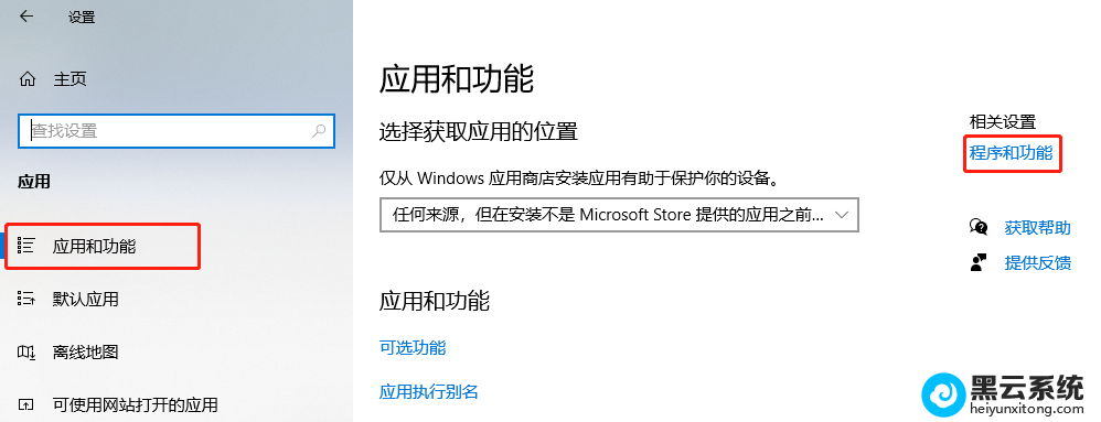 2.???????接着,在“应用”窗口中,选择左侧的“应用和功能”,并在右侧中找到且点击“程序和功能”