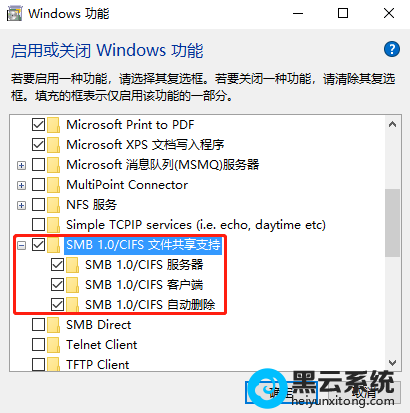 4.???????在弹出的“Windows功能”窗口中找到并勾选“SMB 1.0/CIFS文件共享支持”