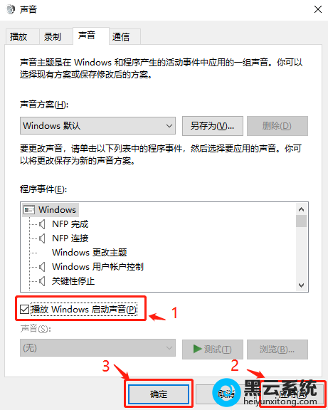 3.???????然后,在弹出的“声音”窗口中,在下面找到并勾选”播放Windows启动声音”,最后点击“应用”->“确定”退出即可生效