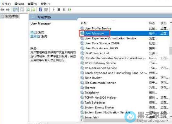 4、这时会打开Win10的服务窗口,在服务列表中找到User Manager服务项;
