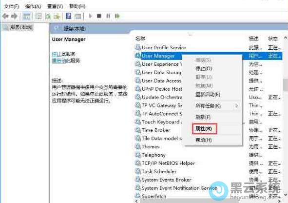 5、右键点击User Manager服务项,在弹出的菜单中选择“属性”菜单项;