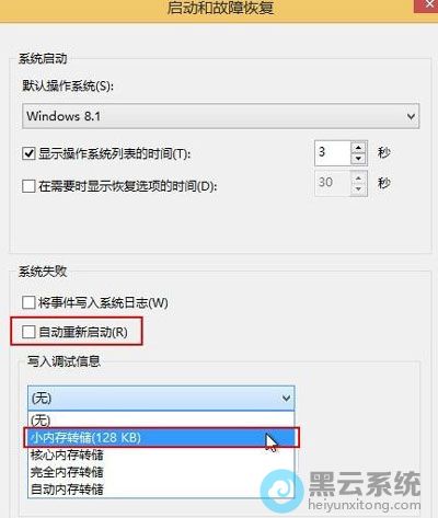 3、在弹出的启动和故障恢复界面中,不勾选自动重新启动复选框,并且在写入调试信息的下拉菜单中,选择小内存转储,然后点击确定按钮;