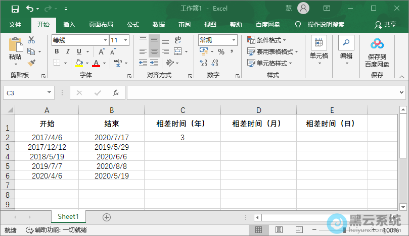 2、首先我们算日期和日期之间相差的年份,点击一个空白单元格,输入函数【=DATEDIF(开始日期,结束日期,“比较单位Y”)】,比较单位有年(Y)、月(M)、日(D);