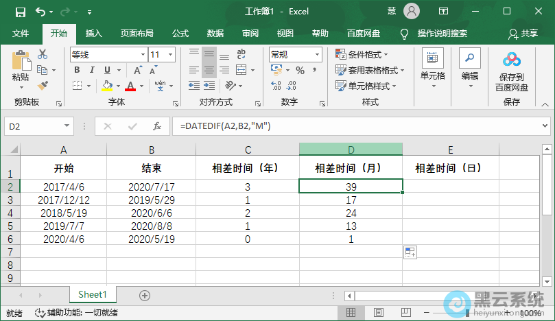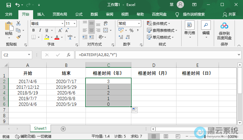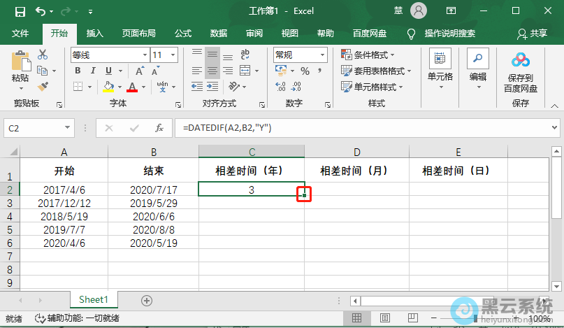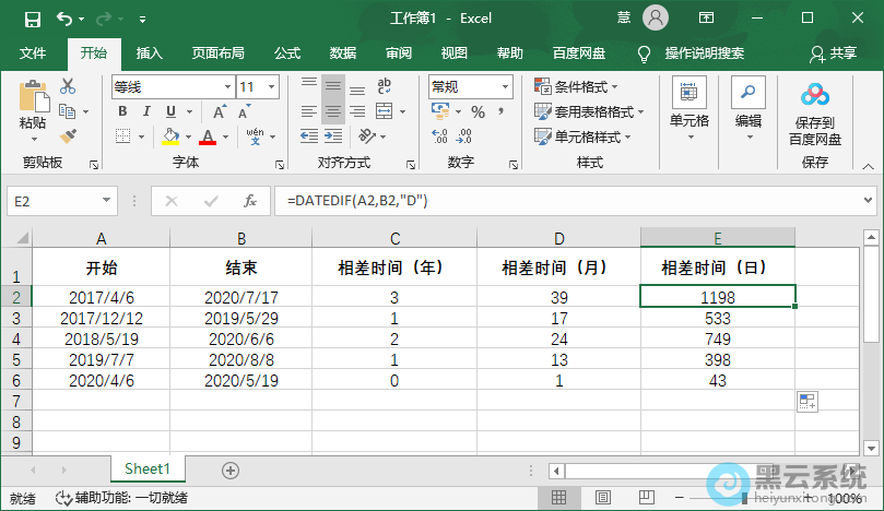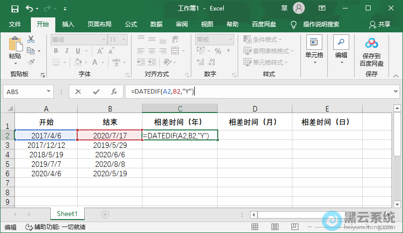 例如【=DATEDIF(A2,B2,"Y")】,开始日期是A2单元格所在的日期,结束日期是B2所在单元格的日期,Y表示求A2和B2之间相差的年份;