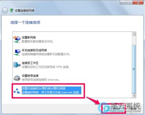 在设置网络或连接中选择设置无线临时网络,然后点击下一步。