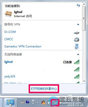 点击电脑右下角的网络图标,然后选择打开网络和共享中心。