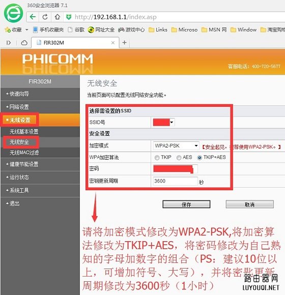 进入斐讯无线路由器的无线安全设置,将加密模式选择为最高级的WPA2-PSK,另外将无线密码修改为较为复杂的密码,密码长度设置在8位以上,最好包含字母和符号,这样可以有效防止蹭网卡破解。