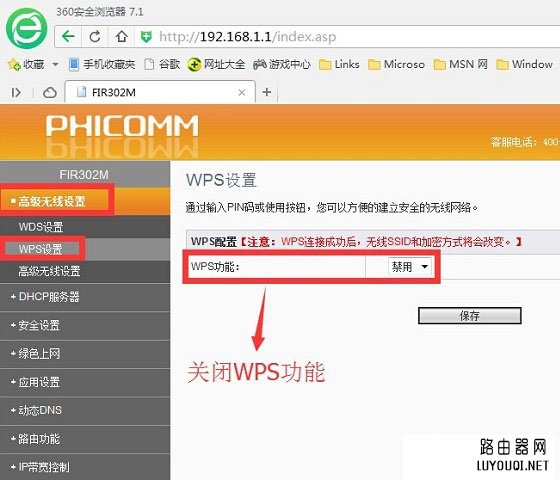 对于多数家庭用户来说,路由器的WPS功能基本都没多大用途,因此建议关闭此功能,以防止蹭网者使用PIN码连接你的网络。斐讯无线路由器关闭WPS功能方法很简单,咋高级设置中的WPS设置中,禁用WPS功能即可,如下图所示。