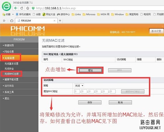 在斐讯无线路由器的无线设置中,进入【无线Mac过滤】设置,首先开启此功能,然后将自己家的电脑Mac和手机MAC地址添加进来,然后保存。