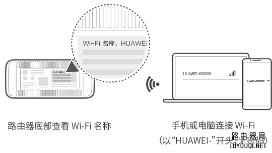 手机或电脑连接路由器的默认Wi-Fi(HUAWEI-XXXXXX或HUAWEI-XXXXXX_5G),Wi-Fi名称请查看路由器底部铭牌。路由器出厂时,Wi-Fi 已开启,并且未加密。